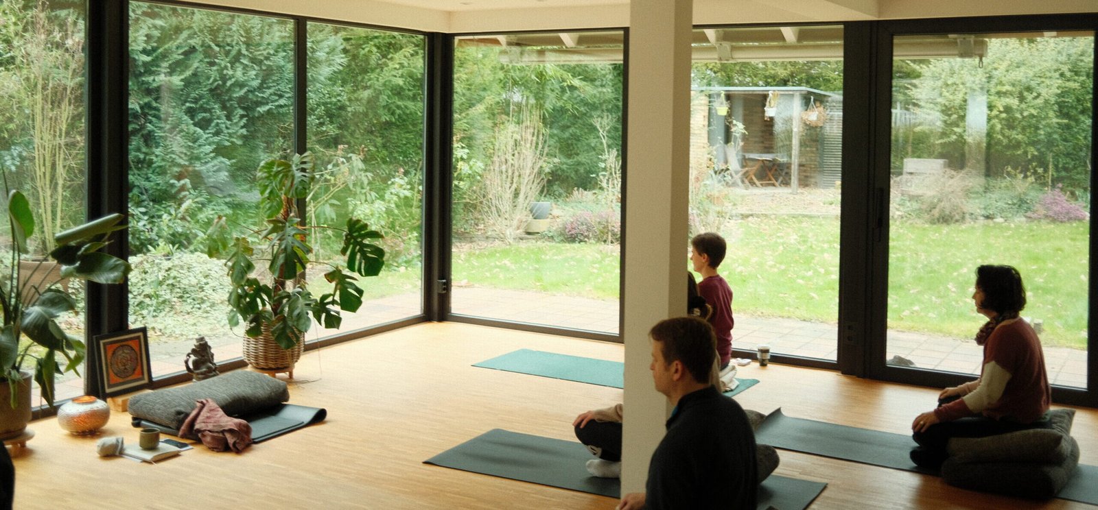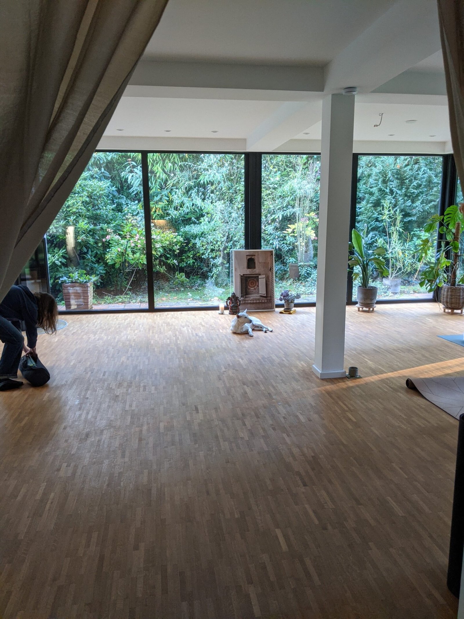 Die Gartenshala ist in Bonn – Bad Godesberg in der Nähe des Kottenforsts inmitten satter, grüner Natur. Mit großen Fensterfronten genießen wir gerade im Winter das Tageslicht. Der Raum kann mit Auto und Bus gut erreicht werden.